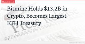 Bitmine Immersion Technologies has revealed its combined crypto holdings, cash, and strategic investments total approximately $13.2 billion. The company now holds 4.07 million ETH, representing 3.37% of Ethereum’s circulating supply, after adding nearly 100,000 ETH last week. This positions Bitmine as the world’s largest Ethereum treasury and second-largest global crypto treasury overall, marking a significant milestone in institutional crypto adoption.